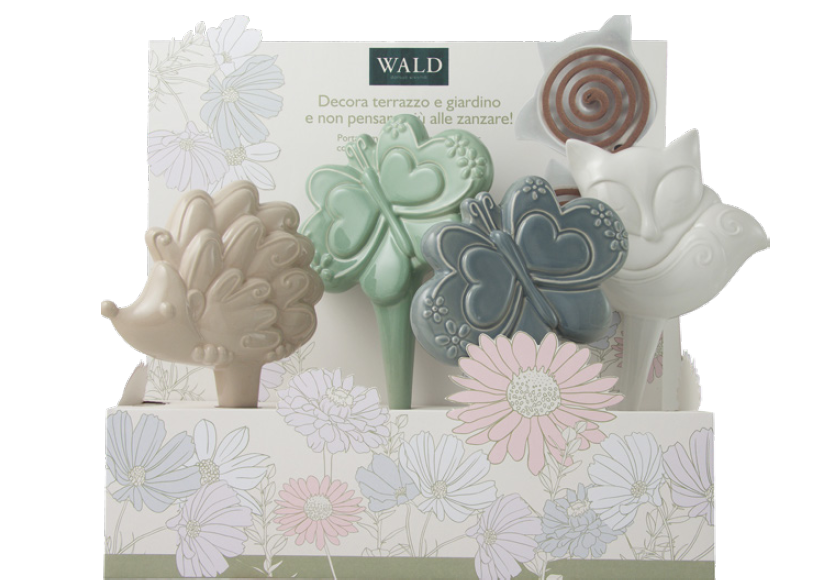 cm 18 x 24.5 (h) - A rovinare una piacevole serata all’aperto d’estate spesso arrivano delle ospiti sgraditissime: le zanzare. Capaci di interrompere una cena in terrazzo o una chiacchierata tra amici in giardino con la loro presenza insistente, le zanzare hanno alcuni acerrimi nemici naturali, come la citronella, il geranio e il rosmarino, di cui occorre circondarsi per prevenire l’invasione di insetti. Ma a volte le piantine non bastano, ed ecco che occorre rivolgersi allo zampirone, il cui supporto è spesso un banalissimo oggetto. Perché non mantenere originalità e stile anche nella lotta alle zanzare? Wald propone una gamma di 12 porta zampironi in ceramica Kergrès® decorata a mano sottosmalto, che rappresenta la soluzione chic contro questi fastidiosi insetti