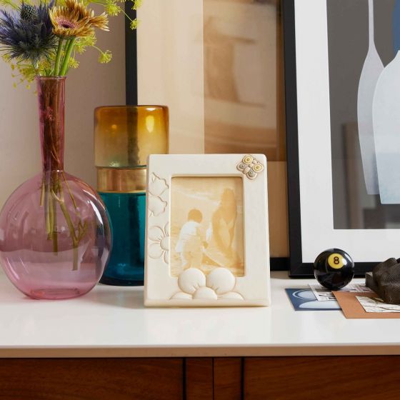 Ogni momento merita di essere ricordato e custodito nel tempo. E per farlo al meglio basterà immortalare attimi speciali ed incorniciarli con il nuovo portafoto in ceramica della linea Elegance. Caratterizzato nel decoro da maxi icone trattate con taglio fotografico dal sapore contemporaneo in un gioco di superfici lucide ed opache, con un’alternanza di elementi sia a rilievo che impressi nella ceramica. Il classico color crema dello sfondo vive anche di giochi chiaro-scuro della patina bruna presente attorno alle icone protagoniste tra cui spicca la tipica farfalla in bassorilievo. Ottima come idea regalo, da personalizzare inserendo all'interno una foto ricordo che renderà il tuo dono ancora più unico ed originale. Codice Prodotto: C2883H90 Materiale: ceramica; telaio in legno di pino; vetro Misure: 30,4x2x35,4 cm h; formato foto 21,1x25,6 cm Cura del prodotto: pulire esclusivamente con un panno morbido asciutto; evita che vengano a contatto con liquidi o prodotti aggressivi; non idoneo al contatto con alimenti