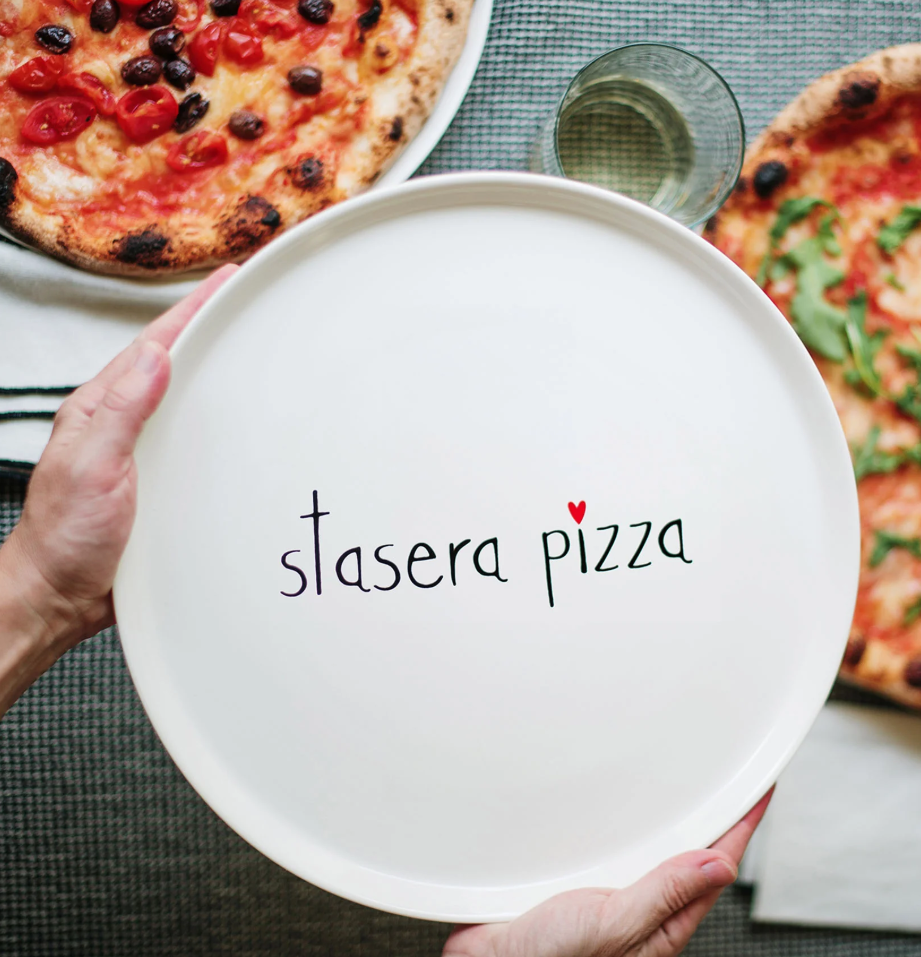 Piatto pizza in gres decoro Stasera pizza 31,5 cm L'aspetto gentile di questo piatto in gres lo rende adattissimo a riscoprire il piacere della pizza mangiata assieme e anche delle tue creazioni fatte in forno Come tutti i prodotti in gres si può lavare in lavastoviglie: abbiamo scelto appositamente la misura di 31,5 cm proprio per toglierti il pensiero di lavarlo a mano, perché è una misura che si può riuscire a inserire in lavastoviglie Bordatura rialzata ideale per contenere la pizza al meglio Quando lo riceverai a casa non riuscirai a non usarlo con famiglia e amici e per le tue serate davanti a un bel film Diametro: 31,5 cm Decoro Stasera pizza Disegnato in Italia