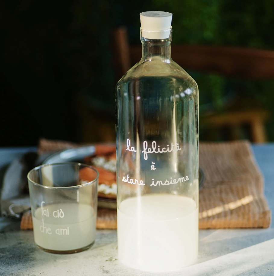 Bottiglia in vetro con decoro La felicità è stare insieme Elemento dal design minimalista e coerente nelle forme, la bottiglia unisce il tuo decoro preferito ad una materia prima d'eccellenza: il vetro borosilicato, spesso e resistente. Ti renderai conto prendendo in mano questa bottiglia che è un piacere trasportarla ed esibirla in tavola per dare un tocco di freschezza e contemporaneità all'apparecchiatura. Di grande capacità (1.4 lt), non ti lascerà mai senza l'acqua (o la tua bevanda preferita). Bottiglia realizzata in vetro borosilicato, un materiale che ha caratteristiche uniche, infatti nonostante sia leggerissimo è molto resistente, super trasparente, molto brillante e facile da pulire Decoro La felicità è stare insieme in colore bianco Puoi lavare tranquillamente la bottiglia in lavastoviglie: raccomandiamo di scegliere il programma da max 50° e di non utilizzare detergenti aggressivi o abrasivi Capienza: 1,4 litri Dimensioni: 9,5 cm x 29 cm Disegnato in Italia