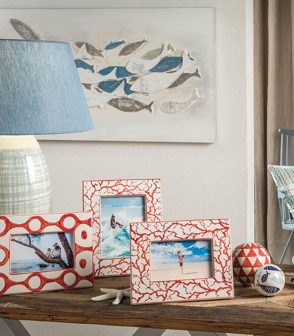Portafoto rettangolare piccolo Portafoto rettangolare piccolo per foto 10x15 cm in ceramica. I decori color corallo rendono l'oggetto ideale per completare un arredamento in stile mediterraneo. E' disponibile anche grande.
