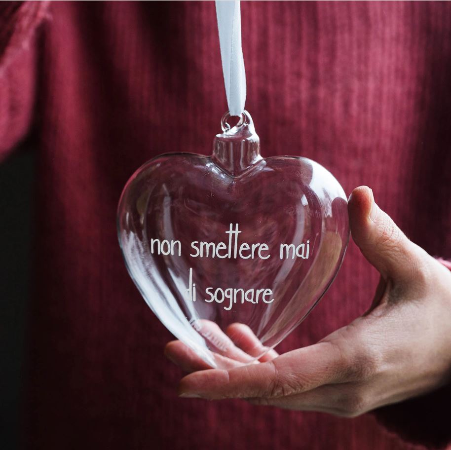 Pallina cuore in vetro borosilicato Non smettere mai di sognare - 11 cm Rallegra i tuoi ambienti con queste bellissime palline in vetro Simple Day! Il loro design è impreziosito da frasi che faranno risplendere la tua casa! Un complemento perfetto per una decorazione dal tocco magico! Realizzata in vetro borosilicato, un materiale che ha caratteristiche uniche, infatti nonostante sia leggerissimo è molto resistente, super trasparente, molto brillante e facile da pulire Decoro Non smettere mai di sognare Cordino incluso (attenzione: il colore bianco o rosso del cordino va in base al colore del decoro della pallina) Inscatolata singolarmente Dimensione: 11 cm Piccole imperfezioni nel vetro posso essere dovute alla lavorazione artigianale Lavare delicatamente con prodotti non aggressivi o abrasivi Disegnato in Italia