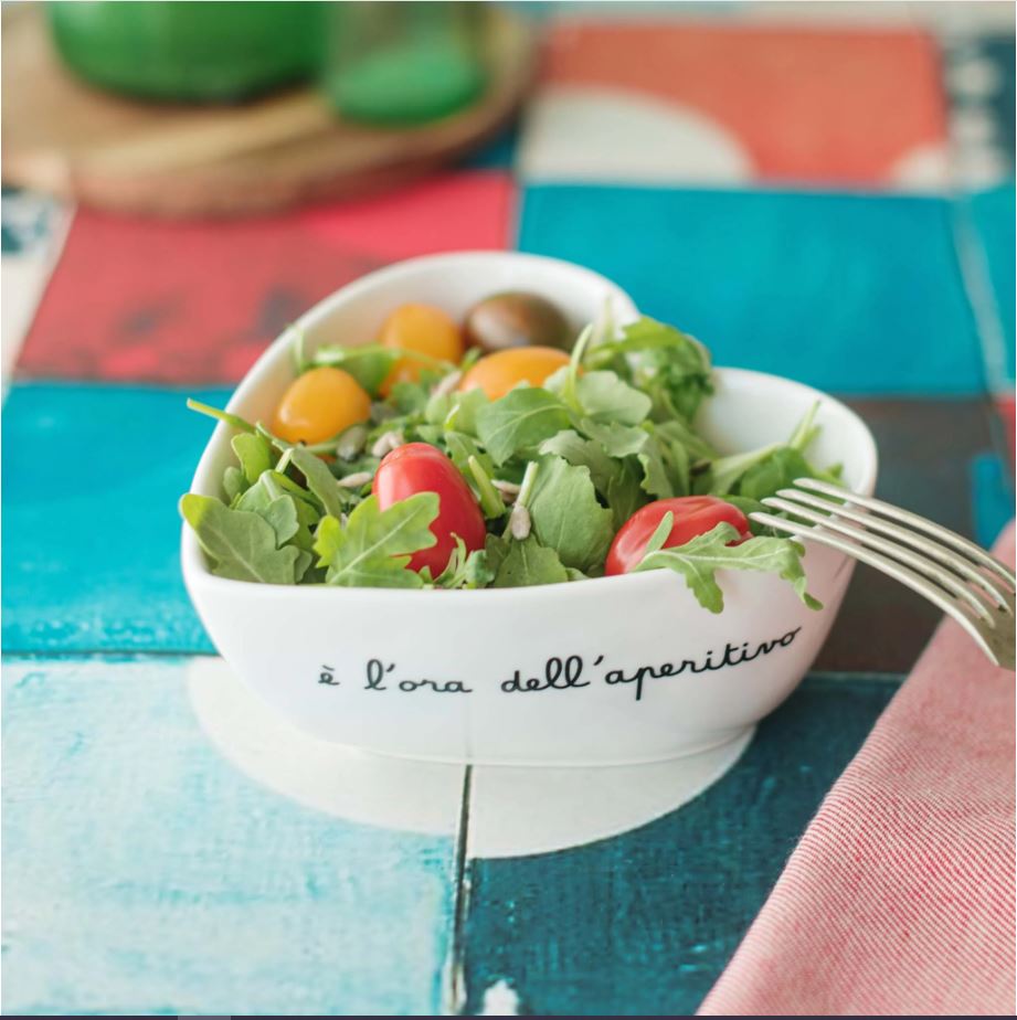 Coppetta cuore in gres decoro E' l'ora dell'aperitivo - Dim. 16 cm Usa le nostre coppette cuore decorate per merende sfiziose o nel modo più comodo che ritieni. Davvero originali e simpatiche da abbinare nei vari decori disponibili. Articolo realizzato in grès: questo materiale è di altissima qualità e garantisce una lunghissima durata nel tempo del prodotto che rimane sempre bello come nuovo anche se usato quotidianamente Decoro E' l'ora dell'aperitivo Serigrafato in nero Lavabile in lavastoviglie: si consiglia una temperatura di lavaggio max. 50° e di non utilizzare detersivi abrasivi o aggressivi Consegnato in scatola in cartone riciclato Dimensioni: 16 cm Disegnate in Italia