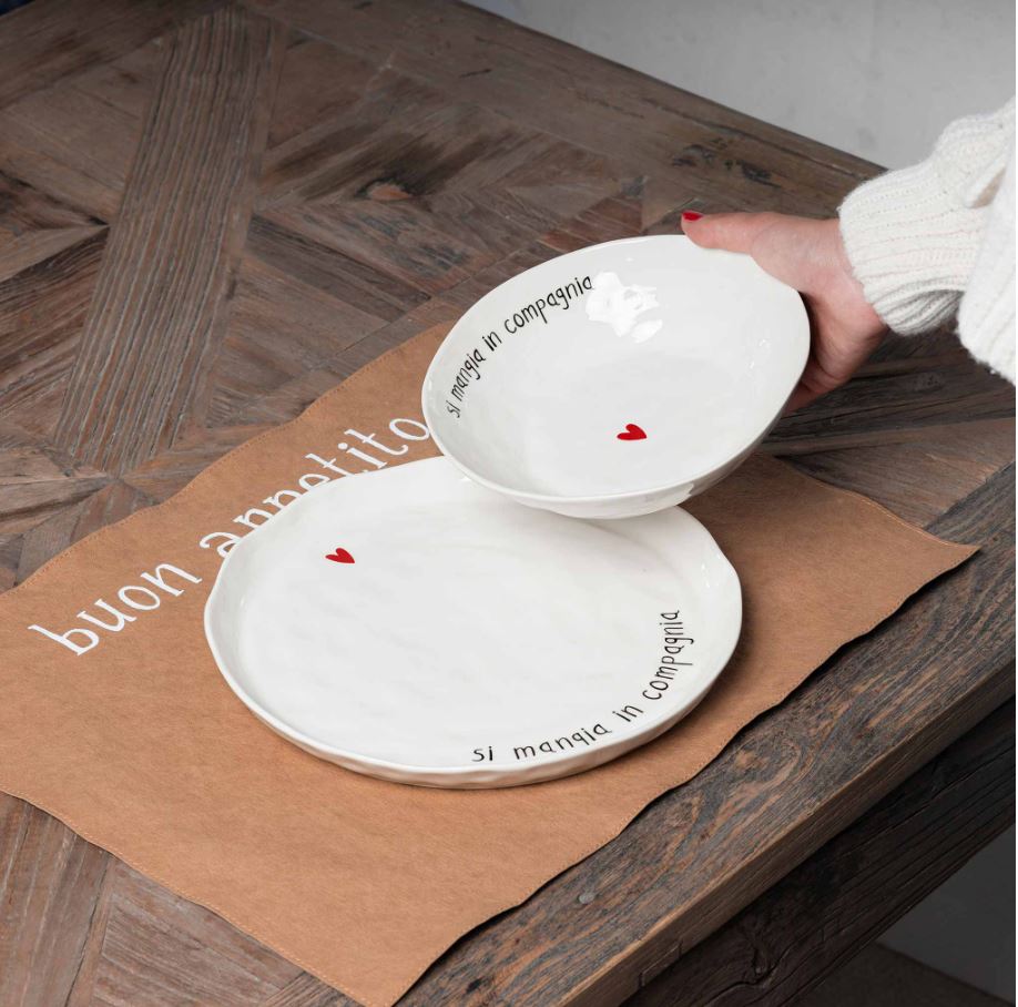 Set 2 Piatti piani decoro Si mangia in compagnia diam. 27 cm Il set di 2 piatti piani renderà la tua tavola speciale. Eleganti e minimali, questi piatti sono perfetti per aggiungere un tocco di stile grazie anche alle serigrafie in nero. I piatti piani sono resistenti e facili da pulire, rendendoli perfetti per servire ogni tua pietanza Diametro 27 cm Decoro Si mangia in compagnia in colore nero Articolo realizzato in gres questo materiale è di altissima qualità e garantisce una lunghissima durata nel tempo del prodotto che rimane sempre bello come nuovo anche se usato quotidianamente Puoi lavare senza nessun problema questo articolo in lavastoviglie Adatto all'utilizzo in forno microonde Finitura effetto organico Disegnato in Italia