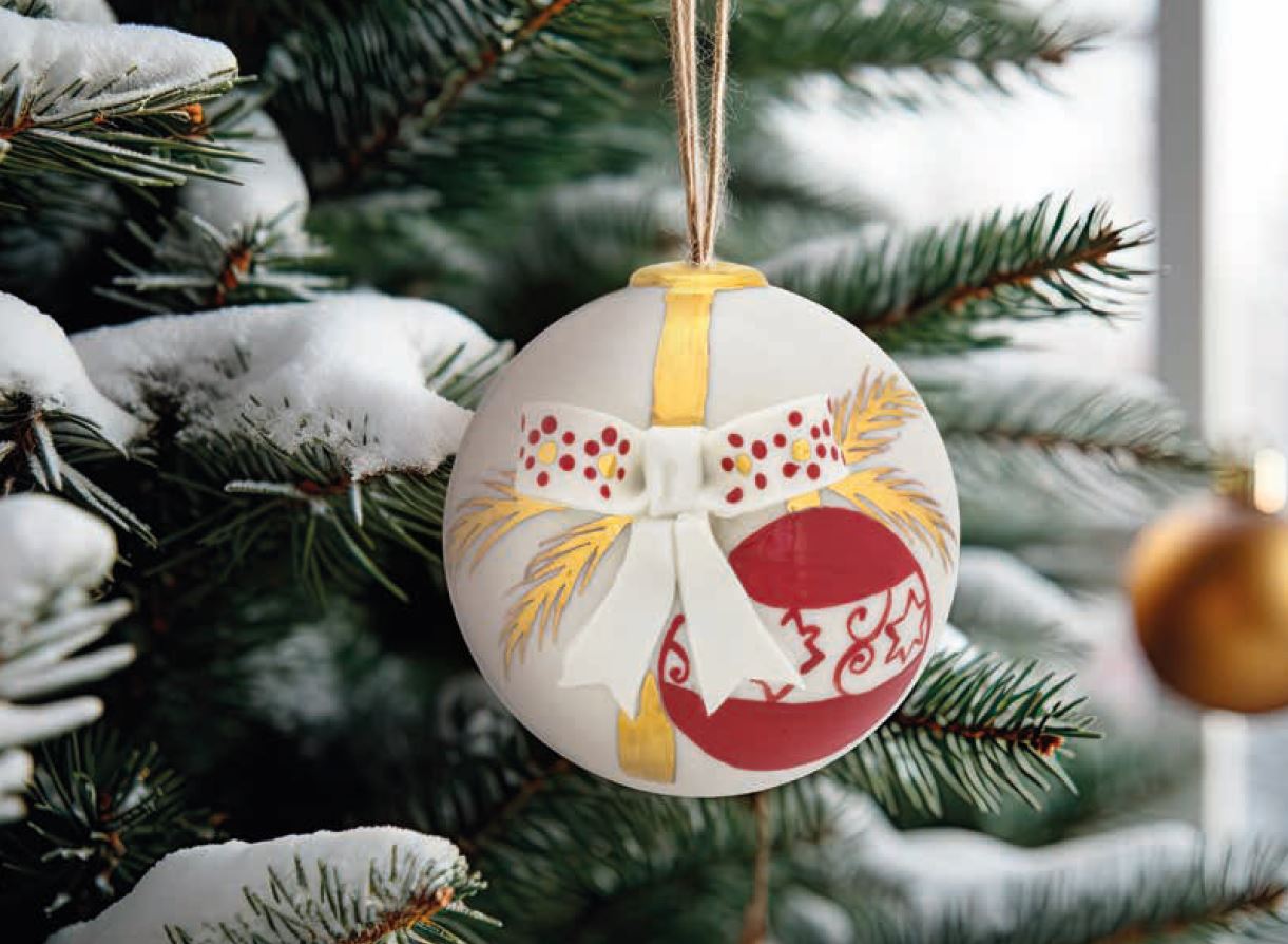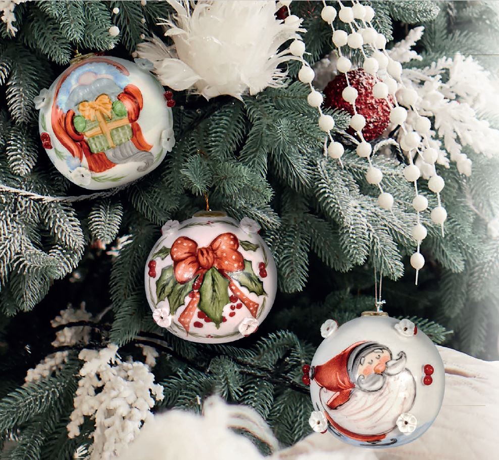 Elegante palla di Natale in finissima porcellana di Capodimonte Decorazione raffinata a rilievo e dipinta a mano con diverse fantasie natalizie, e gancio ad anello dorato PALLINA IN PORCELLANA DECORATA A MANO MISURE DIAM. CM. 10