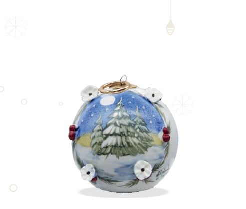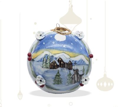 Elegante palla di Natale in finissima porcellana di Capodimonte Decorazione raffinata a rilievo e dipinta a mano con diverse fantasie natalizie, e gancio ad anello dorato PALLINA IN PORCELLANA DECORATA A MANO MISURE DIAM. CM. 10