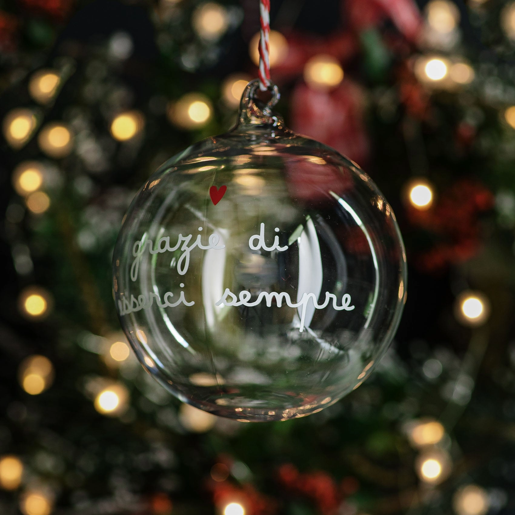 Pallina in vetro borosilicato Grazie di esserci sempre - 12 cm Rallegra i tuoi ambienti con queste bellissime palline in vetro Simple Day! Il loro design è impreziosito da frasi che faranno risplendere la tua casa! Un complemento perfetto per una decorazione dal tocco magico! Realizzata in vetro borosilicato, un materiale che ha caratteristiche uniche, infatti nonostante sia leggerissimo è molto resistente, super trasparente, molto brillante e facile da pulire Decoro Grazie di esserci sempre in bianco Cordino incluso (attenzione: il colore bianco o rosso del cordino va in base al colore del decoro della pallina) Inscatolata singolarmente Dimensione: 12 cm Piccole imperfezioni nel vetro posso essere dovute alla lavorazione artigianale Lavare delicatamente con prodotti non aggressivi o abrasivi Disegnato in Italia
