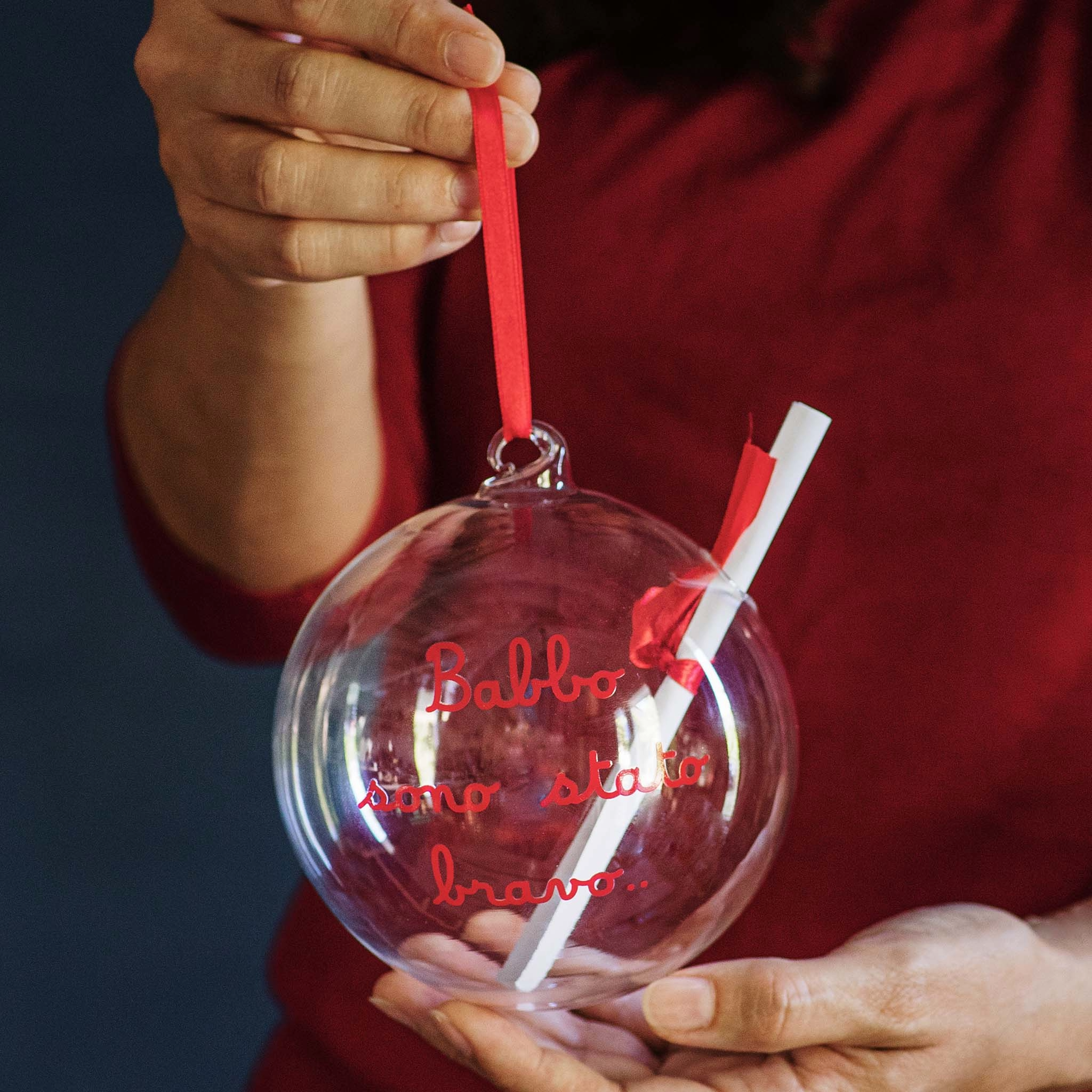 Pallina in vetro borosilicato Babbo sono stato bravo - 12 cm Rallegra i tuoi ambienti con queste bellissime palline in vetro Simple Day! Il loro design è impreziosito da frasi che faranno risplendere la tua casa! Un complemento perfetto per una decorazione dal tocco magico! Realizzata in vetro borosilicato, un materiale che ha caratteristiche uniche, infatti nonostante sia leggerissimo è molto resistente, super trasparente, molto brillante e facile da pulire Decoro Babbo sono stato bravo Cordino incluso (attenzione: il colore bianco o rosso del cordino va in base al colore del decoro della pallina) Inscatolata singolarmente Dimensione: 12 cm Piccole imperfezioni nel vetro posso essere dovute alla lavorazione artigianale Lavare delicatamente con prodotti non aggressivi o abrasivi Disegnato in Italia