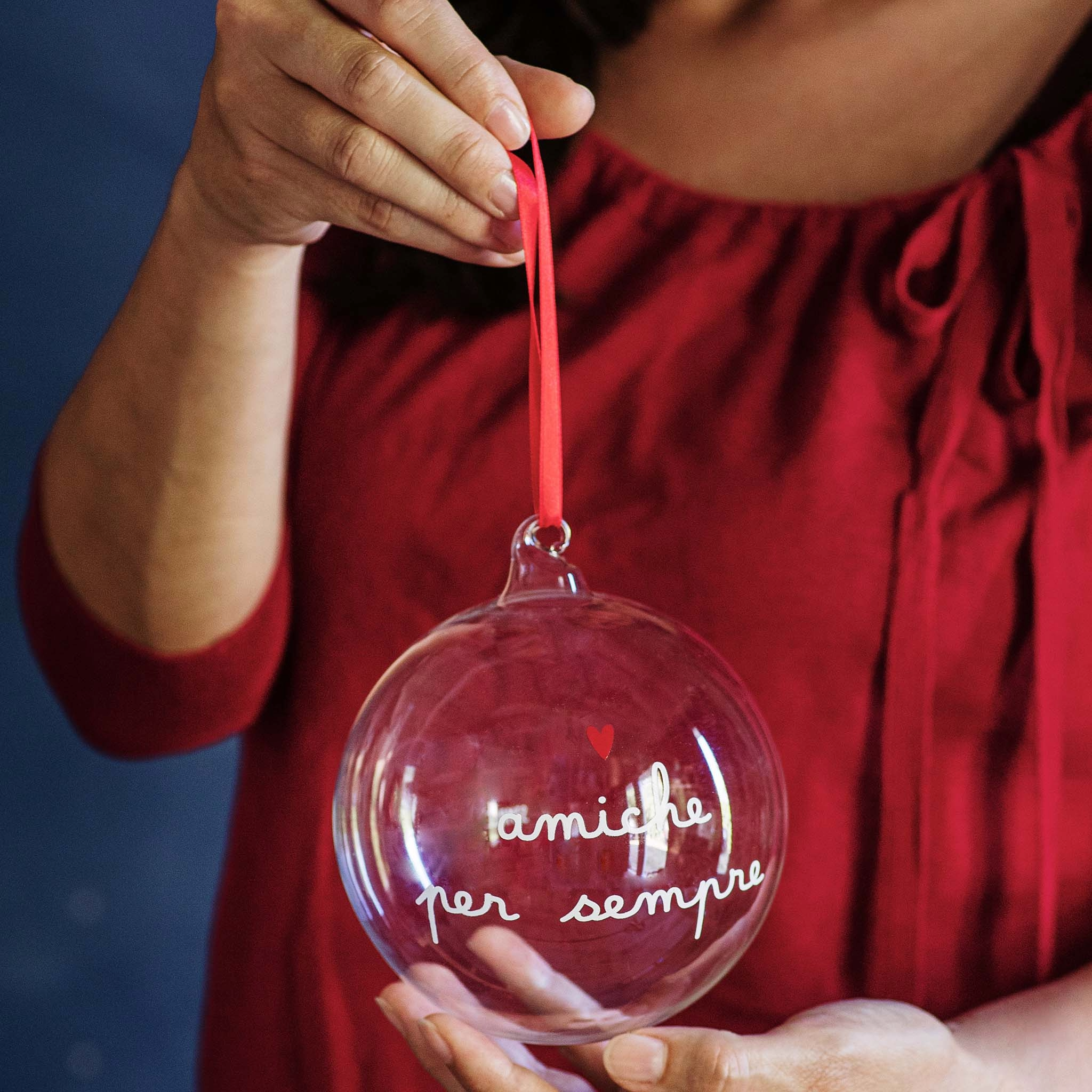 Pallina in vetro borosilicato Amiche per sempre - 12 cm Rallegra i tuoi ambienti con queste bellissime palline in vetro Simple Day! Il loro design è impreziosito da frasi che faranno risplendere la tua casa! Un complemento perfetto per una decorazione dal tocco magico! Realizzata in vetro borosilicato, un materiale che ha caratteristiche uniche, infatti nonostante sia leggerissimo è molto resistente, super trasparente, molto brillante e facile da pulire Decoro Amiche per sempre Cordino incluso (attenzione: il colore bianco o rosso del cordino va in base al colore del decoro della pallina) Inscatolata singolarmente Dimensione: 12 cm Piccole imperfezioni nel vetro posso essere dovute alla lavorazione artigianale Lavare delicatamente con prodotti non aggressivi o abrasivi Disegnato in Italia