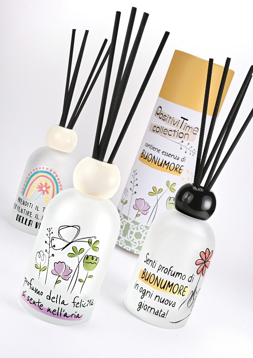 Profumatore ambiente decoro " profumo di buonumore" 4X25H CM Collezione Positivitime Originale profumatore d’ambiente in vetro satinato, decorato con la frase"senti profumo di buonumore in ogni nuova giornata".Contiene la fragranza vanilla cream da 200 ml, dolce e avvolgente, con 5 bastoncini per una diffusione graduale e armoniosa.Completo di confezione regalo originale e colorata, ideale come idea regalo o per profumare i tuoi spazi con stil