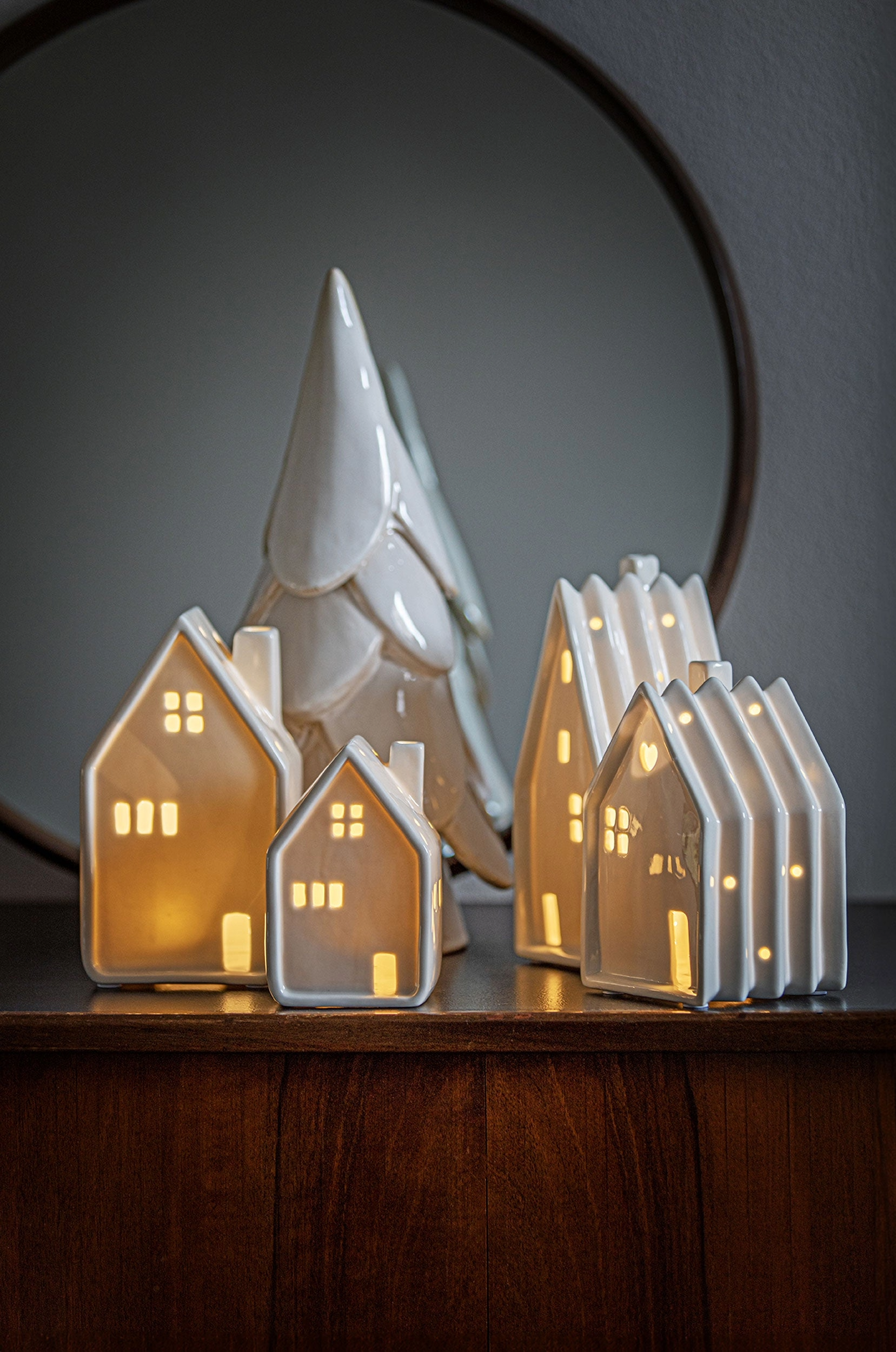L'atmosfera si fa calda ed evocativa con luci ad effetto che albeggiano in piccole case ed alberi. Una collezione di design tutta da collezionare.