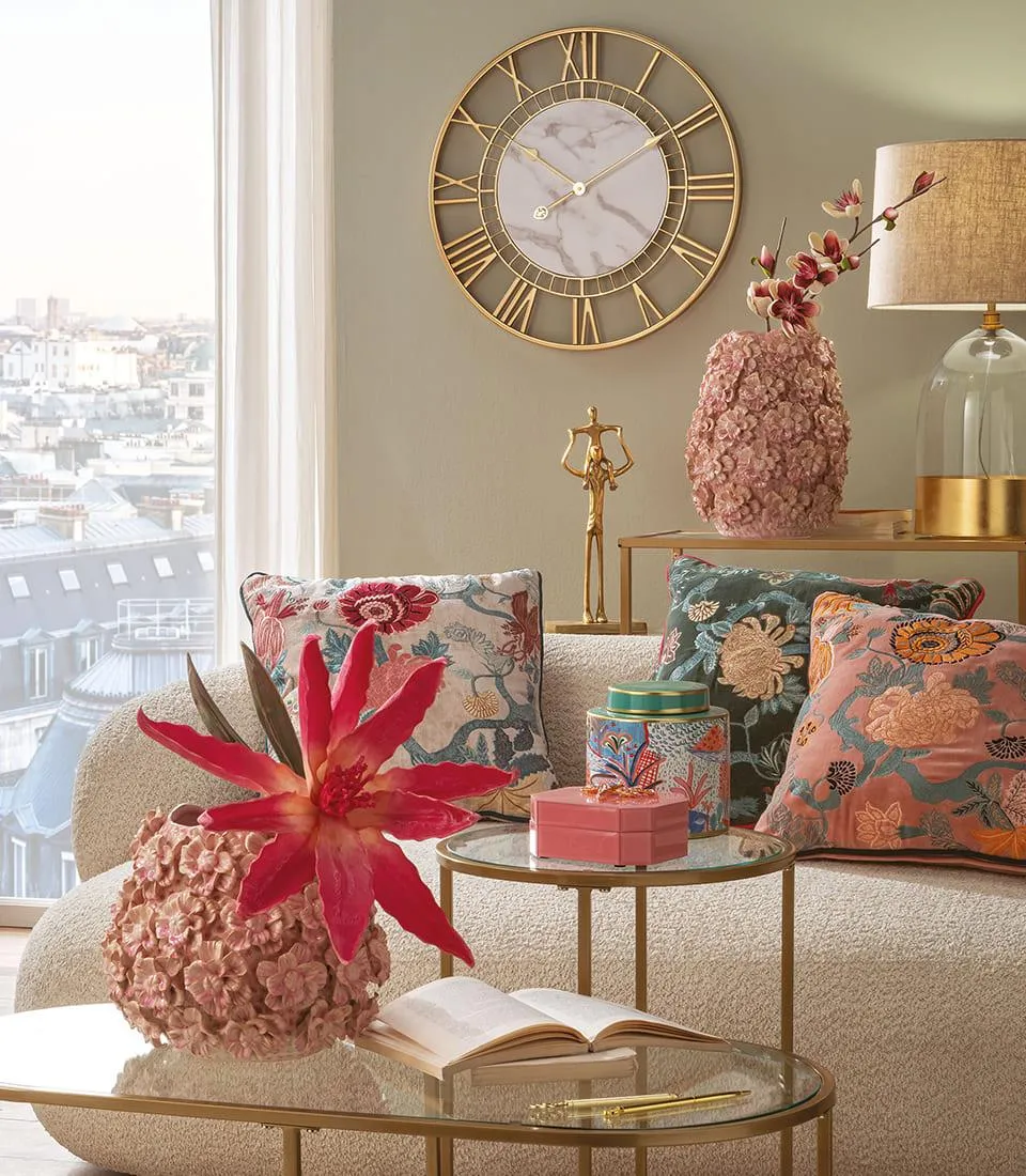 Orologio da parete con centro in effetto marmo e dettagli e bordo traforato in metallo dorato.Pensato per valorizzare pareti ampie. materiale: metallo - MDF | varianti: Ø60x4.5