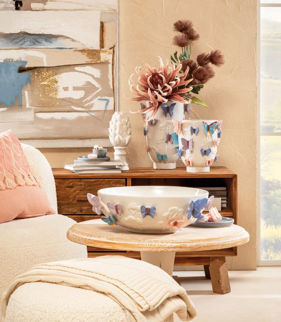 Vaso alto in gres. Decoro in rilievo con motivo fogliato tono su tono e farfalle variopinte per impreziosire la casa. Perfetto da abbinare al vaso basso e al centrotavola coordinato d'ispirazione Modern Country per un living dai dettagli che si connettono con naturalezza. materiale: Gres | varianti: Ø24.5x33honnettono con naturalezza.