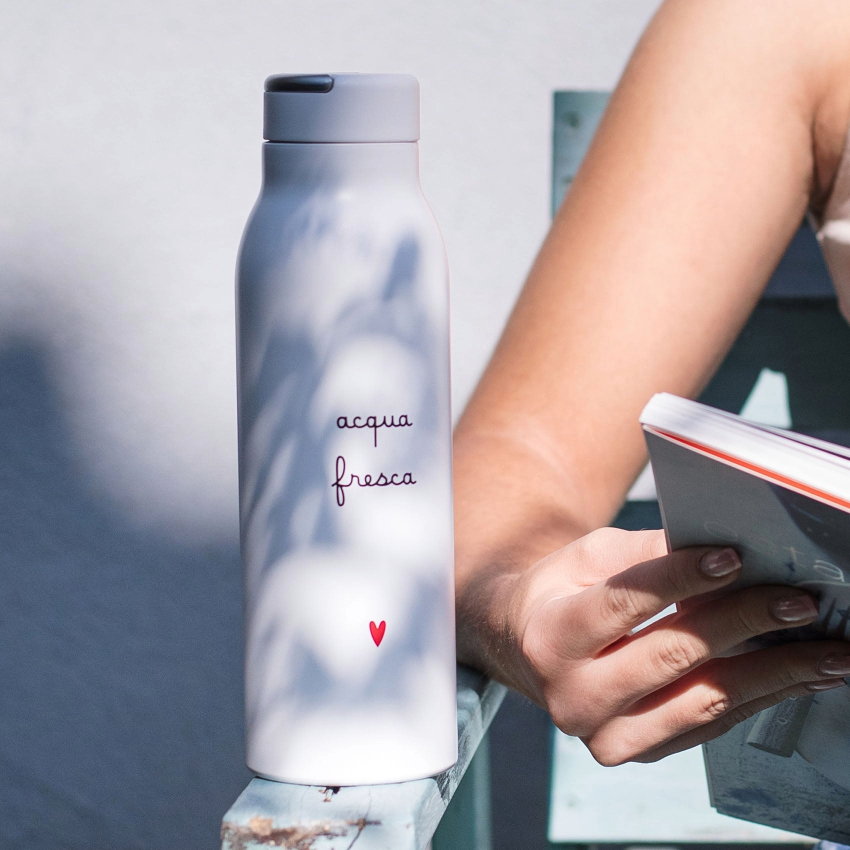 Borraccia termica decoroAcqua fresca - 0,5 l - Dim. d 7 x h 23 cm Elegante e ideale per mantenere la temperatura delle tue bevande preferite fino a 8 h. Con una capacità di 0,5 litri, la borraccia è perfetta per accompagnarti durante le tue giornate. Il suo tappo con anello ti permette di portarla ovunque agganciandola ad esempio a un moschettone. Materiale: Acciaio Capacita: 0,5 l Termica fino a 8 ore Dimensioni: d 7 x h 23 cm Colore: Bianco Decoro nero: Acqua fresca Apertura a vite con anello Non lavare con prodotti abrasivi o aggressivi