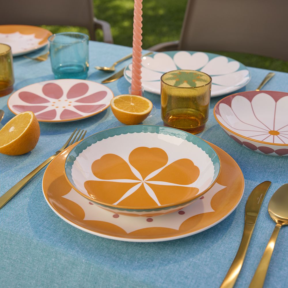 Servizio piatti 18 pezzi Madame Porcellana Multicolor Linea Moon Idoneo al contatto alimentare Idoneo al lavaggio in lavastoviglie Idoneo all’utilizzo in microonde Trasforma ogni momento a tavola in un’esperienza speciale con il servizio piatti 18 pezzi Madame della linea Moon di Tognana, una collezione in porcellana multicolor pensata per chi ama unire eleganza, originalità e atmosfera. Le sue decorazioni raffinate e contemporanee donano personalità alla mise en place, rendendo ogni pranzo o cena un’occasione da ricordare. Realizzato in porcellana, questo servizio garantisce resistenza, brillantezza e praticità nell’uso quotidiano. La composizione per 6 persone, con piatti piani, fondi e dessert, è ideale sia per la tavola di tutti i giorni sia per occasioni speciali, dalle cene in famiglia agli incontri più intimi. Perfetto per creare un’atmosfera calda e accogliente, il servizio Madame è anche una splendida idea regalo: le sue tonalità armoniose e il design ricercato lo rendono ideale per sorprendere chi ami. In occasione di San Valentino, diventa il protagonista di una tavola romantica, dove ogni dettaglio contribuisce a rendere unico il momento condiviso. Pratico e funzionale, il servizio è lavabile in lavastoviglie e idoneo all’Marchio Andrea Fontebasso Colore Multicolor Materiale Porcellana Tipologia prodotto Servizi piatti Composizione 18 piatti: 3 piatti piani 27 cm fantasia azzurra, 3 piatti piani 27 cm fantasia arancione; 3 piatti fondi 20 cm fantasia tonalita del viola, 3 piatti fondi 20 cm fantasia arancione, 3 piatti dessert 19 cm fantasia azzurro/arancio, 3 piatti dessert 19 cm fantasia arancio/violauso in microonde, unendo bellezza e comodità in un unico prodotto.